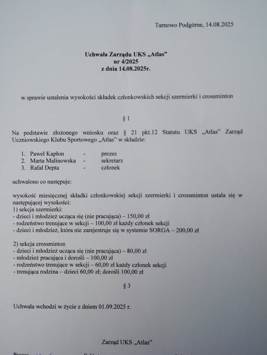 Po kilku latach niezmiennej wysokości składek, w skutek rosnących cen i wydatków Zarząd UKS ATLAS podjął uchwałę o podniesieniu wysokości składek członkowskich w obu sekcjach szermierczej i crossmintona.